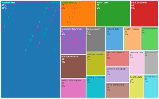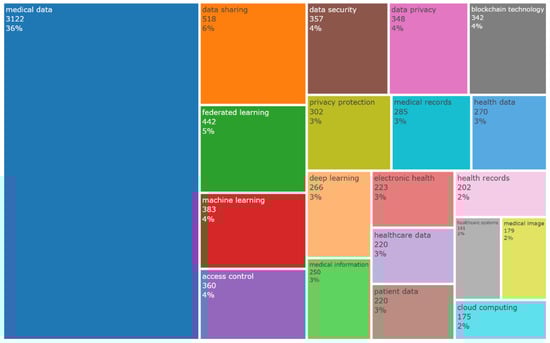 Finally, in the period from 2016 to 2024, the focus expanded further with “medical data” remaining central, while new terms like “data sharing”, “federated learning”, “blockchain technology”, and “machine learning” reflect the rise of advanced technologies in healthcare (Figure 6). This period highlights the shift toward leveraging artificial intelligence, distributed systems, and blockchain for secure data sharing and analysis, alongside continued attention to “data privacy” and “privacy protection”. The increased frequency of these terms reflects not only technological innovation but also a research community responding to new challenges and opportunities in data security, privacy, and data sharing. Thus, the evolution of publication patterns is closely intertwined with the adoption and development of key health information technologies. Consequently, the research landscape becomes increasingly diversified, with emerging topics and specialized subfields reflecting the complexity of these innovations. This diversification leads to less homogeneous publication trends, as the focus of research shifts to address a broader array of technical, ethical, and practical issues introduced by these technologies.