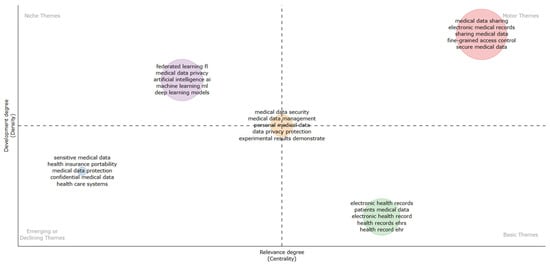 To provide a comprehensive overview of the landscape across the entire period, we conducted a thematic analysis, incorporating trigrams extracted from abstracts to capture nuanced conceptual relationships (Figure 7). A thematic map of this sort reveals the intellectual structure of the field, highlighting key areas of research and their interrelationships. “Motor themes” represent the driving forces of the field; in our case, they suggest a primary focus on the practical challenges of making medical data accessible while maintaining security standards. “Basic themes” form the foundational knowledge and are centered on “electronic health records,” confirming them to be the fundamental building block of the domain. “Niche themes” indicate specialized areas of intense investigation, and are centered around artificial intelligence; “emerging or declining themes” suggest areas of evolving interest. The themes clustered around the center of the map act as a bridge between the different quadrants. They represent core concerns that are relevant to all areas of the field and will be commented on in the Discussion Section.