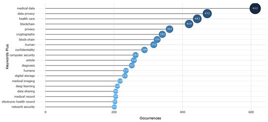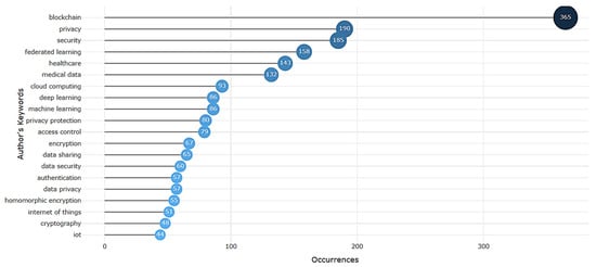 While both keyword sets exhibit a pronounced focus on “blockchain”, “privacy”, and “security”, the indexed keywords demonstrate a more pronounced emphasis on medical domain-specific terminology, such as “medical data”, “medical imaging”, and “electronic health record”. In contrast, the author-assigned keywords display a broader thematic scope, encompassing “federated learning”, “deep learning”, and “cloud computing”, which suggests a more expansive consideration of technological applications in the medical domain.
