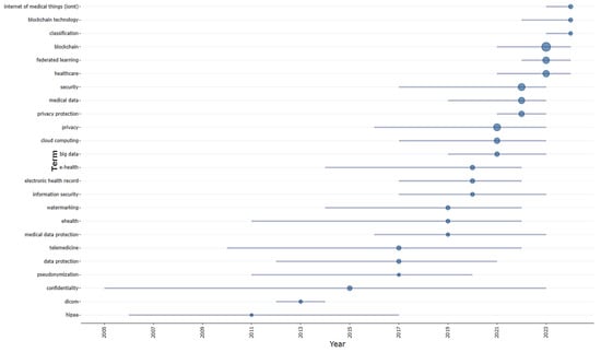 Regarding trend topics over time, we took into consideration three authors’ keywords/year, appearing at least 10 times/year (Figure 10). Given the sparse literature of the previous century, trends in the authors’ interests could only be identified after 2005. The analysis revealed a chronological progression of the main themes in research surrounding data protection in medicine. The earliest and most longstanding topic is that of “confidentiality”, spanning the entire timeline; yet, “privacy” and “security” became prominent after 2020. “Telemedicine”, then “e-health”, and now “internet of medical things” became some of the most discussed topics of the last decade, and so are “pseudoanonymization”, then “cloud computing”, and then both “blockchain” and “blockchain technology”. There is a clear evolution from basic data handling and security concerns to the application of advanced technologies like blockchain, federated learning, and IoMT, all while maintaining a strong focus on privacy and security. The graph illustrates the increasing complexity and sophistication of research in this field over time.
