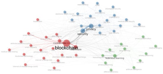 The network appears to be divided into three main clusters, indicated by the red, blue, and green. This suggests three relatively distinct, yet interconnected, areas of research. The red cluster is heavily centered around “blockchain,” “medical data,” and “healthcare.” This indicates a strong research focus on applying blockchain technology to manage and secure medical data within the healthcare sector. Related keywords include “smart contracts,” “privacy protection,” “Internet of Medical Things (IoMT),” and “edge computing,” suggesting exploration of decentralized, secure, and connected healthcare solutions. The blue cluster revolves around “privacy” and “security,” which are strongly interconnected. This cluster includes terms like “data security,” “encryption,” “confidentiality,” “e-health,” and “telemedicine.” This suggests a focus on the fundamental aspects of data protection and secure communication in healthcare. The green cluster is centered around “federated learning,” “artificial intelligence,” and “privacy-preserving” techniques. This indicates a research area focused on advanced analytics and machine learning methods that prioritize data privacy. Connections to “medical imaging” and “COVID-19” suggest applications in specific healthcare domains.