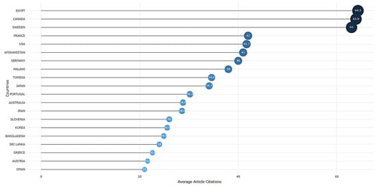 China leads by a wide margin in total citations, indicating a massive overall research output in this field (Figure 16). When considering average citations (Figure 17), countries like Egypt, Canada, and Sweden rise to the top, while China falls out of the top rankings. Several less influential countries, such as Tunisia and Portugal, have high average citation rates, suggesting that they are producing high-quality research that is having a significant impact, even if their overall publication volume is limited. The USA performs well in both metrics.