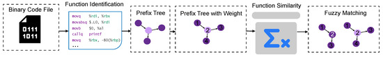 In the training phase, we initially generate binary code for a series of candidate processes and determine the starting address of each function. Based on these addresses, we construct a prefix tree to store and match different processor optimization processes. The prefix tree efficiently stores strings by sharing common prefixes, with each node representing a potential function start instruction. Node weights are determined by the recognition rate . This structure facilitates rapid identification and classification of function entry points. Table 1 provides the notation and abbreviations.