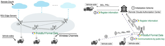 Certificate authentication plays an indispensable role in today’s information systems, mainly in confirming the legitimacy of user identities and granting corresponding access permissions when users access target system resources over the internet. For VANET systems, authentication is the first and most important line of defense. In researching authentication techniques, ref. [24] proposed a new decentralized VANET authentication protocol using a novel group signature scheme which provides threshold authentication, efficient revocation, unforgeability, anonymity, and traceability. In [25], the authors introduced a novel conditional privacy-preserving authentication protocol for VANETs which binds public keys into pseudonyms to ensure non-repudiation by obtaining real IDs of misbehaving vehicles. In [26,27], a multi-domain vehicle authentication architecture was proposed by introducing blockchain technology to establish distributed trust and share cross-domain information among multiple administrative domains. In [28], the authors proposed a novel privacy-preserving authentication protocol based on a certificateless aggregated signature scheme that allows users to generate fuzzy identities to hide their real identities; in this scheme, even the private key can remain unchanged if the corresponding pseudonym is updated.