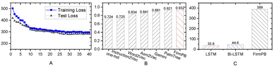 Figure 5B,C further validates FirmPB’s advantages. In Figure 5B, FirmPB achieves higher detection accuracy within the Gemini framework compared to other embedding methods, particularly when contrasted with its FirmPB-W/o-G variant that lacks graph structural information. These results demonstrate the critical importance of integrating graph structures for model performance. Figure 5C confirms FirmPB’s significant advantage over conventional sequence models such as LSTM and Bi-LSTM, likely because FirmPB is better suited for handling nonlinear control flows and data dependencies in firmware code. This effectively reduces false positive rates while maintaining high true positive rates