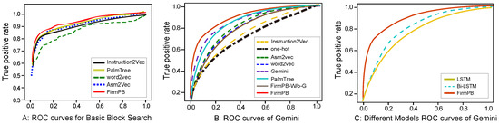 The ROC curves in Figure 5A–C demonstrate significant differences in embedding performance across various models. Figure 5A illustrates that the FirmPB model substantially outperforms traditional approaches such as Instruction2Vec, word2vec, Asm2Vec, and PalmTree in basic block search tasks. The ROC curve’s position closer to the upper left-hand corner indicates superior balance between true positive and false positive rates. This superior performance can be attributed to FirmPB’s enhanced capability to capture semantic features of basic blocks, whereas traditional models exhibit limitations when processing complex structures in firmware binary code.