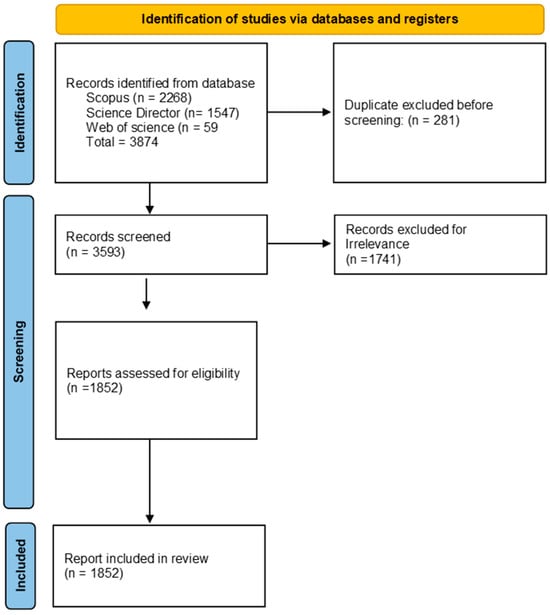 In total, 3874 papers were collected within all fields. A first quick content check was conducted by only selecting titles, abstracts, and keywords to determine whether the content of the articles aligned with the criteria mentioned above. After the papers that did not meet the criteria were excluded, a total of 1852 papers were considered. The VOS viewer model was used to analyze the data. A VOS viewer (Version 1.6.20) is a software tool used for creating and visualizing bibliometric networks; it offers advanced text mining capabilities to construct co-occurrence networks of significant terms from the scientific literature, aiding in the analysis of research trends and relationships [73].