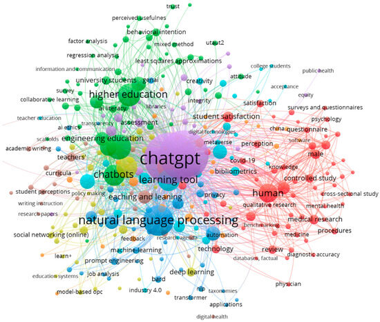At the core lies “ChatGPT”, encircled by various clusters. The green cluster concentrates on higher education and learning, featuring terms like “higher education”, “university students”, and “assessment”, suggesting substantial research on the integration of ChatGPT into educational environments. The red cluster pertains to human research, encompassing “human”, “medical research”, and “mental health”, indicating an interest in applying ChatGPT in the healthcare and medical domains. The blue cluster centers on natural language processing and associated technologies, incorporating terms such as “natural language processing”, “machine learning”, and “deep learning.” The purple cluster consists of terms related to user satisfaction and perception, such as “student satisfaction”, “perception”, and “trust”, indicating interest in how users perceive and experience satisfaction with ChatGPT. The smaller yellow cluster encompasses specific technologies and applications like “chatbots” and “AI literacy”.