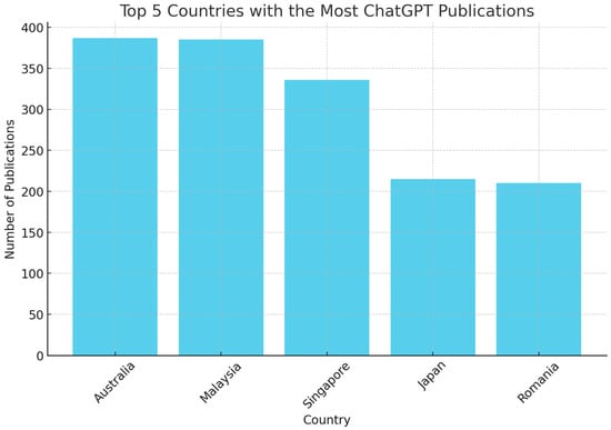 Figure 3 below showcases the top five countries with the most publications on ChatGPT from 2022 to 2024. Australia leads with 387 publications, closely followed by Malaysia with 385, indicating significant interest and research activity in these regions. Singapore, Japan, and Romania also show substantial contributions, with 336, 215, and 210 publications, respectively. This distribution suggests that the Asia–Pacific region is highly active in AI research, particularly in exploring the applications and implications of ChatGPT in higher education. The close numbers for Australia and Malaysia imply competitive research output, potentially driven by strong academic and technological frameworks supporting AI research in these countries. The prominent research activity in these countries can be attributed to several factors, including robust technological infrastructures, significant investments in AI and higher education, and a strong presence of academic institutions prioritizing AI research. This trend highlights global recognition of the importance of ChatGPT and similar AI technologies in transforming educational practices. This focus on AI research in the top contributing countries underscores their commitment to advancing AI-driven educational tools, addressing ethical considerations, and exploring practical applications to enhance learning experiences. Overall, the data reflects a growing global emphasis on integrating AI technologies like ChatGPT into educational frameworks, driven by competitive academic environments and supportive research ecosystems.