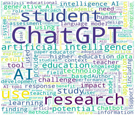 According to Figure 6 below, the word cloud generated from the abstracts highlights the key themes and frequently discussed terms in the publications Commonly highlighted words include “students”, “education”, “AI”, “learning”, “technology”, and “performance”, reflecting the focus on educational applications and the impact of AI technologies. The analysis shows a robust and growing body of research on ChatGPT, driven by its increasing relevance in education and other fields. Ethical considerations, equitable access, and integration with traditional teaching methods are central themes in the research community. The leading countries in this research are making significant contributions to understanding and harnessing the potential of ChatGPT.