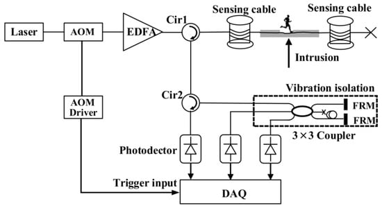 The distributed acoustic sensing (DAS) system is a sophisticated distributed fiber-optic acoustic monitoring system and exhibits exceptional sensitivity in capturing vibrational disturbances indicative of intrusions across diverse and complex scenarios. This system leverages the principles of Φ-OTDR and the spatial differential interference of high-correlation backscattered Rayleigh light for its operation. It facilitates the precise localization of fiber optic impairments, including attenuation, breaks, and bends. The schematic of the Φ-OTDR system is illustrated in Figure 1. The system employs a narrow pulse laser to emit a highly coherent light source. This light undergoes modulation via an acousto-optic modulator (AOM), transforming continuous light into pulsed light, which is subsequently amplified by an erbium-doped fiber amplifier (EDFA). The amplified signal is then injected into two ports of a circulator within the sensing cable. Rayleigh scattering occurs within the fiber, and the backscattered light is received by the circulator. External intrusion events induce vibrations in the sensing cable, leading to localized changes in refractive stress. Consequently, the backscattered light undergoes interference, resulting in corresponding intensity variations. The detector captures the Rayleigh backscattered light reflected from various points along the fiber, extracting the disturbance signals to accurately pinpoint intrusion events, thereby enabling the detailed monitoring of phase variations in power cables [10].