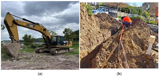 Task one involved a 120 kW, two-ton excavator performing excavation activities at various radial distances, generating a dataset of mechanical operation scenarios. Task two simulated illegal hammering excavation through manual excavation and impact at different radial distances, with the bucket striking the ground at distances of 0, 1, 2, 3, …, up to 15 m, including measurements at 2, 4, 6, 8, 10, 12, and 14 m, which were pre-measured and marked with red lines. Vehicle passage was primarily recorded by capturing four seconds of data as vehicles passed nearby. The DAS monitoring system sampled data at a frequency of 1 kHz, with each intrusion signal comprising 2500 sampling points at an interval of 1.29 m. This system, independently developed by Chengdu Shengting Technology Co., Ltd. (Chengdu, China), integrates distributed fiber optic sensing, real-time intelligent analysis, and early warning capabilities into a unified platform.