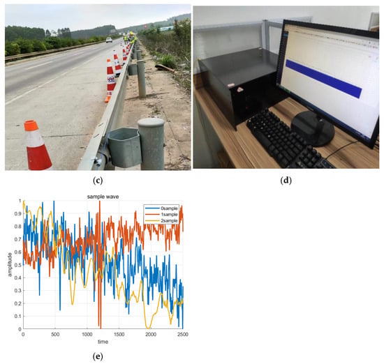 With the active assistance of personnel from Chengdu Shengting Technology Co., Ltd. (Chengdu, China), we conducted on-site experiments in Chengdu, Sichuan Province, China, from October to November 2024. An optical fiber was embedded approximately one meter underground within a 48-core pipeline communication cable used as a sensing fiber. The DAS monitoring system equipment was located in Sandaojian Baiyun Village, Pidu District, Chengdu, where three types of event data were collected and artificially simulated. The total length of the monitoring fiber was 33 km, with the test site approximately 6.6 km from the installation point. On-site data collection records are shown in Figure 2a–c (The picture was taken at the construction site), with the DAS device used for data acquisition depicted in Figure 2d. The resulting DAS intrusion detection waveform is presented in Figure 2e. The weather during the field tests was mild, with no heavy rain, ensuring normal operation across all scenarios.