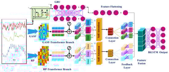 The GRT-Transformer model’s identification framework, as presented in this study, is illustrated in Figure 3. This model employs a three-branch, parallel, and collaborative end-to-end architecture designed for the extraction of multi-dimensional features from intrusion data. Specifically, the GASF and RP branches convert one-dimensional time-series intrusion waveform data into two-dimensional images, which, in conjunction with the Transformer, extract the global trends of the signals. This approach effectively enhances the model’s capacity to capture the spatial features of intrusion waveform data. Simultaneously, a Gated Recurrent Unit (GRU) algorithm branch directly extracts the one-dimensional time-series dynamic features of the intrusion waveforms, enabling the model to comprehensively learn the multi-dimensional data characteristics of the intrusion waveforms. The model’s terminal utilizes a BiLSTM (Bidirectional Long Short-Term Memory) network to deeply fuse the multi-dimensional features extracted by the three branches, further capturing the bidirectional temporal dependencies within the DAS intrusion data. This integrated strategy not only significantly improves the model’s accuracy in identifying various intrusion events of the model’s recognition capabilities by filtering out intrusion events not surrounding the DAS-based power cables but also ensures the stability intrusion event interference in complex environments. The DAS power cable intrusion detection algorithm based on the multimodal Transformer that we constructed is shown in Algorithm 1.