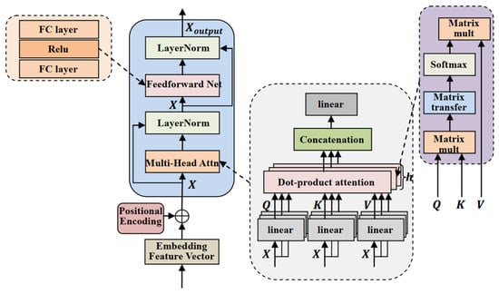 The Transformer model’s performance is primarily achieved through a self-attention mechanism. This mechanism is composed of two key components: multi-head self-attention (MSA), which integrates multiple self-attention heads, and scaled dot-product attention, which is employed for the attention calculation within each head. By dynamically assigning weights, the model captures the interdependencies among elements within a sequence. The self-attention mechanism provides a global receptive field, with the multi-head attention structure illustrated in Figure 7. The parallel computation of attention h times yields multiple parameter-independent subspaces, thereby enhancing the model’s capacity to focus on diverse features.