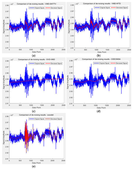 The raw intrusion data acquired via the DAS system are contaminated by environmental noise, leading to a degradation in signal quality. Consequently, denoising algorithms are essential for preprocessing the raw data. This paper introduces an enhanced Variational Mode Decomposition-based denoising algorithm, VMD-SWTTV. To evaluate the denoising performance, we conducted tests on randomly selected raw DAS intrusion monitoring data samples. To ensure consistent Signal-to-Noise Ratio (SNR) across samples, 5 dB of Gaussian white noise was added prior to denoising. The addition of Gaussian white noise resulted in the emergence of numerous spikes and glitches within the samples. Subsequently, the denoising results of five different algorithms are compared, as illustrated in Figure 9, which presents the denoising outcomes of VMD-SWTTV, VMD-WTD, SVD-VMD, CEECMSA, and WAVELET algorithms on the raw DAS intrusion monitoring data. The results demonstrate the effective suppression of spikes and glitches. Notably, VMD-SWTTV and VMD-WTD exhibited the best denoising performance, followed by WAVELET threshold denoising. Conversely, SVD-VMD and CEECMSA algorithms introduced signal distortion in the denoised DAS data. To assess the performance of the five denoising algorithms, we employed the SNR and Root Mean Square Error (RMSE) as performance metrics for evaluating the denoising methods applied to DAS intrusion monitoring signals. The SNR and RMSE calculations are detailed below.