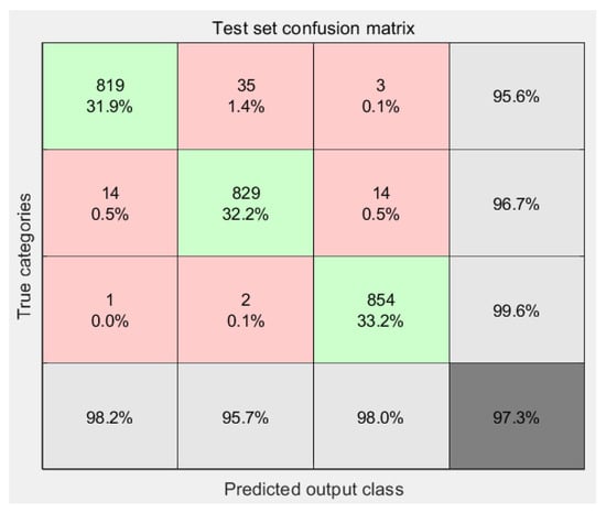 The confusion matrix for the validation set. (Green: Identify the correct part; Red: Identifies the erroneous parts; Light gray: The recognition accuracy rates corresponding to the three events respectively; Dark gray: Average recognition accuracy of all events).