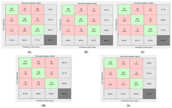 The confusion matrix results for the identification of three types of DAS power cable intrusion events are presented for the following models: (a) CDIL-CBAM, (b) DBN-LSTM, (c) CDIL-BiLSTM-CBAM, (d) CNN-Dense, and (e) GRT-Transformer. (Green: Identify the correct part; Red: Identifies the erroneous parts; Light gray: The recognition accuracy rates corresponding to the three events respectively; Dark gray: Average recognition accuracy of all events).