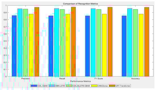 The GRT-Transformer model proposed in this paper demonstrates superior performance in the identification of intrusion disturbance events in DAS power cables. To highlight the advantages of our proposed algorithm, we compared its performance with that of the CDIL-CBAM, DBN-LSTM, CDIL-BiLSTM-CBAM, CNN-Dense, and GRT-Transformer algorithms, which were previously investigated. Figure 14 presents the confusion matrix results for the identification of three intrusion events on the validation set for the five recognition models. The recognition accuracy rates for the five models are 85.4%, 95.8%, 94.1%, 88.1%, and 97.3%, respectively. The GRT-Transformer model proposed in this paper achieves the highest recognition accuracy. The comparative results of the precision, recall, F1 score, and accuracy metrics for the five recognition algorithms are illustrated in Figure 15.
