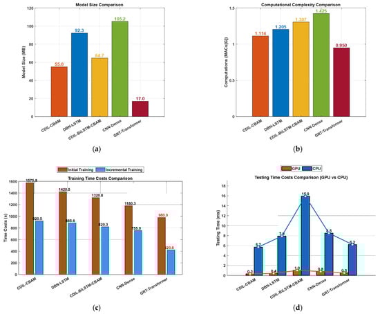 To compare the computational efficiency advantages of the GRT-Transformer model against other models, we evaluated five models based on parameters such as model size, computational complexity, and the time costs associated with the offline training and online testing of individual spatiotemporal samples, as illustrated in Figure 16a–d. The GRT-Transformer model has a parameter size of only 17.0 MB, representing a 69.1% reduction compared to the suboptimal model CDIL-CBAM (55.0 MB), thereby enhancing hardware compatibility for edge deployment. Its computational complexity is 0.950 G, a 14.7% improvement over the baseline CDIL-CBAM (1.114 G), significantly reducing the energy consumption bottleneck during real-time inference. The incremental training time for the GRT-Transformer is merely 20.8 s, representing a 36-fold acceleration over traditional models such as CNN-Dense (which requires 755.0 s), supporting high-frequency model iterations. The GPU inference latency of the GRT-Transformer is 0.5 ms, a 3.6-fold speedup compared to the average latency of the other four models, enabling a full-link response to cable intrusion events within 200 ms. These results demonstrate that, within the proposed GRT-Transformer framework, shared feature extraction and redundancy layer removal significantly minimize computational resource requirements and time costs. Consequently, synchronized event detection in DAS with tens of thousands of sensor nodes can be efficiently performed online, even on standard CPUs. This presents a promising approach for large-scale or ultra-large-scale DAS tasks.
