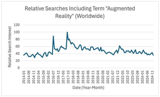 Google Scholar relative search interest—search interest relative to the highest point—of the term “augmented reality” in 2014–2025.