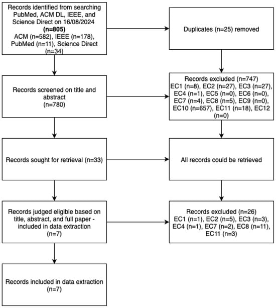 The final search was run on the 28th of February 2025 (28/02/2025), with 805 total records returned (ACM: 582, IEEE: 178, PubMed: 11, Science Direct: 34). Once collated, there were 25 duplicates, leaving 780 records for title and abstract filtering. A total of 747 records were excluded at the title and abstract filtering stage, leaving 33 records to be retrieved and read in full. A total of 26 records were excluded after reading them in full, leaving 7 records for the final data extraction. The PRISMA-ScR diagram (Figure 2) details how many records were included and excluded at each stage in line with the inclusion and exclusion criteria.