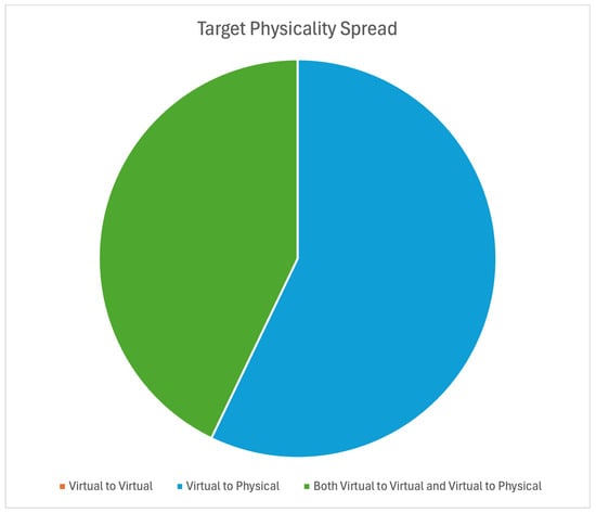 Figure 3 shows the distribution of publication years across the data corpus, with most (three) papers published in 2023 and two papers published in 2024. Figure 4 illustrates C8 describing the physicality of the objects used in the study task. The tasks in four of the studies fell into “virtual-to-physical” category; i.e., the participant was asked to move a virtual object relative to a physical target. The tasks in three studies included both virtual-to-physical and virtual-to-virtual elements. No studies investigated purely virtual-to-virtual stimuli.
