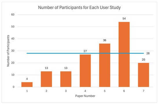 Figure 5 shows the number of participants enrolled in each study, with a mean average of 28. This includes one study enrolling just 4 participants, while all others had 13 or more participants. This difference in the number of participants was due to the specialised and intensive nature of the user task, involving participants specific to the application and a much longer engagement.