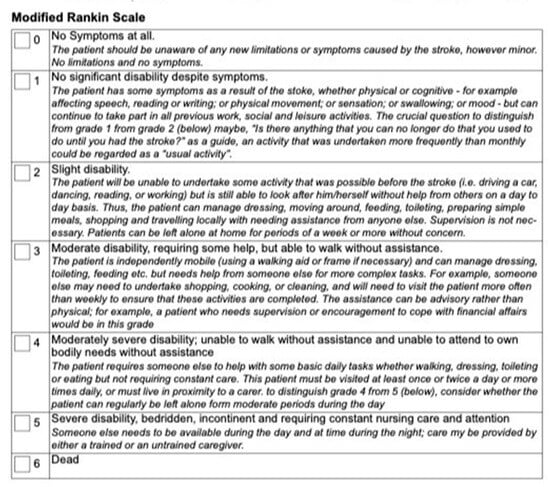 - Zeltzer, L. Modified Rankin Scale (MRS). Stroke Engine. Available online: https://strokengine.ca/en/assessments/modified-rankin-scale-mrs/#Purpose (accessed on 19 April 2008).