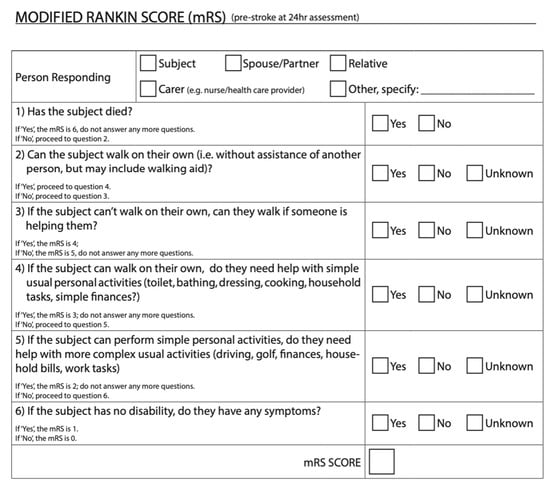 - Banks, J.L.; Marotta, C.A. Outcomes validity and reliability of the modified Rankin scale: Implications for stroke clinical trials: A literature review and synthesis. Stroke 2007, 38, 1091–1096. [Google Scholar] [CrossRef] [PubMed]