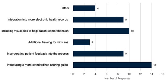 In response to how participants thought the mRS could be improved for both clinicians and patients (Figure 4). Here, we found that 28.6% responded “introducing a more standardized scoring guide”, 20.41% said “including visual aids to help patient comprehension”, 18.37% said “incorporating patient feedback into the process”, 18.37% stated “integrating the mRS into more electronic health records would be beneficial”, 6.12% said “additional training for clinicians” and 8.16% chose “other”. Responses under other included