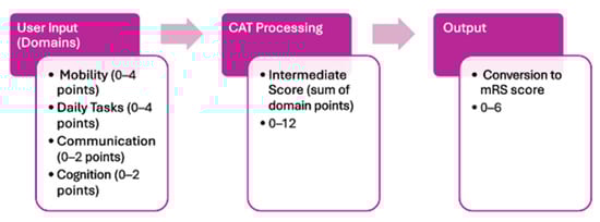 To improve the consistency and usability of the modified Rankin Scale (mRS), we propose a clinical assessment tool (CAT) designed using principles from human–computer interaction (HCI), cognitive engineering, and established usability heuristics. The basic model can be seen in Figure 5. There should be a simple user input which will lead to the CAT processing the input which will then produce an output of an mRS grade. The CAT should guide users through the mRS assessment using a structured process that will include unambiguous questions, and a comprehensive scoring guide that will lead to the existing mRS grades. Grounded in evidence-based guidelines, the CAT should reduce subjective interpretation and increase the inter-rater reliability, streamlining decision-making. The design of the CAT is guided by core principles aimed at reducing cognitive load and ensuring a seamless user experience. These principles prioritize usability, efficiency, and accessibility to support clinicians and patients in accurately assessing post-stroke recovery across all settings [15].