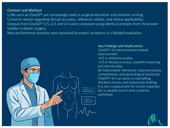 From a technical perspective, the most striking improvement lies in ChatGPT-4.5’s reference behaviour. Both Xie, Seth, Hunter-Smith, Rozen, Ross and Lee [] and Seth, Sinkjær Kenney, Bulloch, Hunter-Smith, Bo Thomsen and Rozen [] reported frequent hallucinations or misattributions in GPT-3.5 outputs, with some references being fabricated or improperly cited []. The absence of such errors in GPT-4.5 underscores the positive impact of improved training datasets and citation validation algorithms []. This has significant implications for the safe use of LLMs in academic and clinical contexts, where misinformation can have substantial downstream effects.