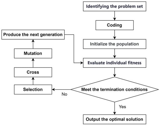 GA draws on Darwin’s concepts of natural selection and genetic mechanisms. Based on the rules of the fitness function, GA uses operations such as selection, crossover, and mutation to evaluate and screen each individual in the set, retaining the most optimal individuals. The specific process of GA is shown in Figure 2.