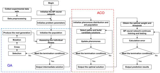 The core idea of the model is to use the weights and thresholds of the BP neural network as optimization objectives. First, the initial solution of the BP neural network is used as input for the genetic algorithm. Leveraging the genetic algorithm’s initial global search capability, a rough local range close to the optimal solution can be quickly identified, yielding a suboptimal intermediate solution. The convergence direction of the obtained intermediate solution is closer to the optimal solution and is independent of the initial values. Then, we use the intermediate solution obtained by the GA algorithm as the initial input for the ACO algorithm to initialize the pheromone distribution. Leveraging the ACO algorithm’s high efficiency in local convergence during the later stages, we can quickly compute the intermediate solution and obtain the optimal solution. The specific flowchart of the GA-ACO-BP model is illustrated in Figure 4: