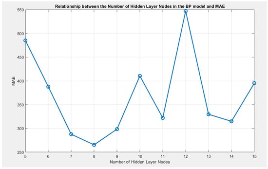 To analyze the impact of the number of hidden layer nodes on the prediction accuracy of the BP neural network, we designed a comparative experiment in the validation set to examine the mean absolute error (MAE) of the model under different node counts. The results are shown in Figure 5. The experimental results indicate that as the number of hidden layer nodes increases from 5 to 8, the MAE gradually decreases, suggesting that the prediction accuracy of the BP neural network for tourist flow has improved. When the number of hidden layer nodes exceeds 8, the MAE increases and becomes more volatile, indicating that the BP neural network faces the risk of overfitting, leading to reduced prediction stability. When the number of hidden layer nodes is set to 8, the MAE reaches its minimum value, at which point the BP neural network achieves the best tourist flow prediction performance. Therefore, in subsequent experiments, the number of hidden layer nodes is uniformly set to 8 to ensure fair comparison among models under identical structural conditions.