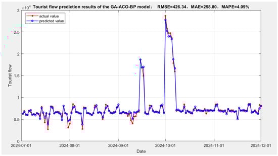 Figure 6 shows the comparison between the prediction results of the GA-ACO-BP model on the test set and the actual tourist flow. Overall, the model’s predicted values are highly consistent with the actual data. In terms of three key error metrics, the model demonstrates low error rates: RMSE is 426.34, MAE is 258.80, and MAPE is 4.09%. A low RMSE indicates that the model has good fitting capability for data with significant fluctuations; a low MAE suggests that the model has minimal overall prediction bias; and a low MAPE further validates that the model maintains high stability and accuracy across different scales of tourist flow.