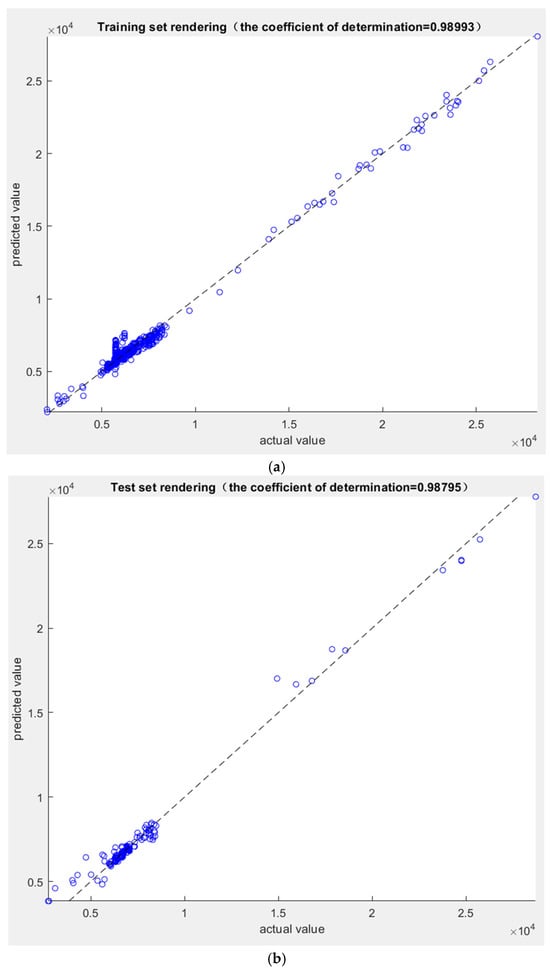 Figure 7 shows the coefficient of determination (R2) of the GA-ACO-BP model on the training set and test set. The R2 for the training set is 0.98993, and that for the test set is 0.98795, both of which are close to 1. This indicates that the model has good fitting performance on different datasets, with prediction results highly consistent with actual tourist flow, demonstrating strong generalization capabilities.