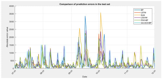 To validate the effectiveness of the GA-ACO-BP model, we compared it with several commonly used prediction models, including BP [6], LSSVM [10], LSTM [8], ELM [34], and PSO-BP [35]. The prediction performance of each model on the test set is shown in Table 2. Figure 8 shows the absolute error variation trends of different models on the test set for an intuitive comparison of their prediction accuracy and stability.