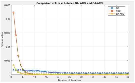 Figure 9 shows the fitness change curves of the GA, ACO, and GA-ACO algorithms. Fitness is an important metric for evaluating the quality of solutions in intelligent optimization algorithms; the smaller the value, the closer the solution is to the ideal state and the better the algorithm performance. In the initial stage, the GA algorithm has the lowest fitness value (0.00157), followed by the GA-ACO algorithm (0.00325), while the ACO algorithm has the highest fitness value (0.02239). The ACO algorithm, due to insufficient pheromone distribution in the initial stage, relies primarily on random search mechanisms, resulting in a higher initial fitness value. In contrast, the GA-ACO algorithm uses intermediate solutions obtained from the GA to initialize the pheromone distribution, resulting in a significantly lower initial fitness value compared to the standalone ACO algorithm. During subsequent iterations, the ACO algorithm converges significantly faster than the GA, due to its faster local convergence capability. The GA-ACO algorithm demonstrates superior convergence speed, achieving a final fitness value lower than that of the GA or ACO algorithms alone, indicating higher optimization efficiency. This characteristic makes it particularly suitable for real-time tourist flow prediction scenarios with high requirements for prediction speed. Specifically, the fitness value after convergence is for the ACO algorithm, for the GA algorithm, and for the GA-ACO algorithm, further validating the synergistic advantages of the GA-ACO algorithm in global search and local optimization.