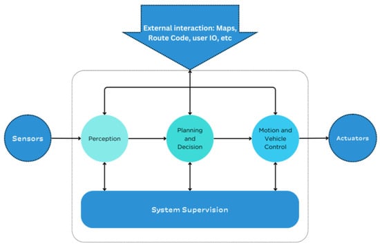 Overseeing all the above modules is the System Supervision (also referred to as the vehicle management or coordination layer). This module monitors the overall operation of the autonomous driving system to ensure it functions safely and reliably [17,24]. The key responsibilities of system supervision are: