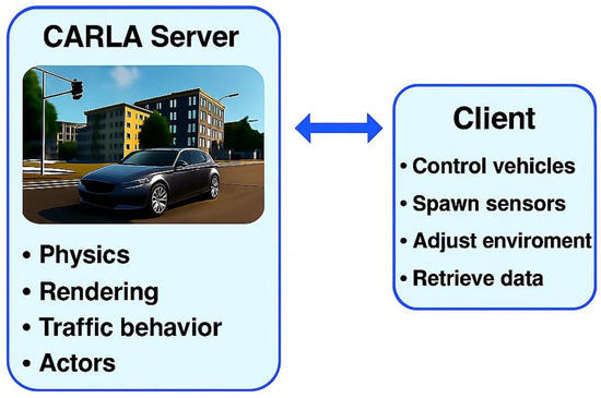 CARLA is built on Unreal Engine 4, which allows for advanced rendering and physics simulation (a new version is being built using Unreal Engine 5). The simulator operates using a client–server architecture (Figure 2) where: