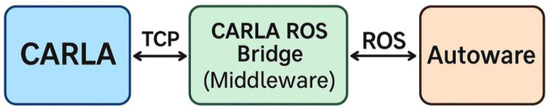ROS is an open-source middleware framework widely adopted in robotics research and development. It offers a modular architecture based on a publish–subscribe communication model, wherein distributed software components, referred to as nodes, exchange information through topics. ROS additionally provides comprehensive tools for sensor integration, data visualization, debugging, and simulation control. Figure 3 is a simplified diagram of the communication between CARLA and Autoware.