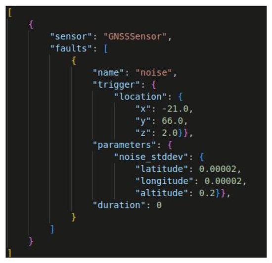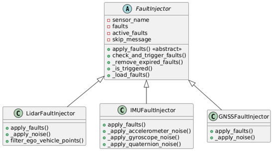 Sensors used in autonomous vehicles can be classified into two categories: internal state sensors (proprioceptive sensors) and external state sensors (exteroceptive sensors) [25]. A survey of these sensor technologies, their roles, common failures, and mitigation strategies was presented in our previous work [26]. The remainder of this subsection summarizes the most relevant aspects for the fault injection study described in this article. Proprioceptive sensors are responsible for measuring the internal state of the vehicle. This group includes systems such as inertial measurement units (IMU), inertial navigation systems (INS), and encoders. Encoders provide critical feedback on components like steering, motor position, braking, and acceleration, enabling accurate assessment of the vehicle’s position, motion, and odometry [27].