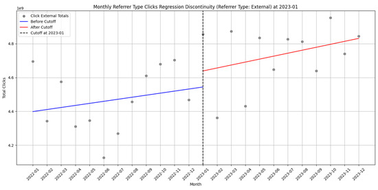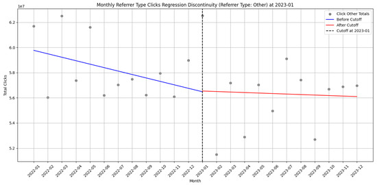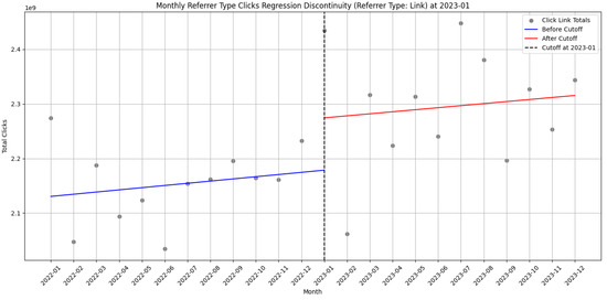 Table 1, Table 2 and Table 3 present results of the statistical tests. We found statistically significant increases in monthly link referrer–page pairs after the cutoff. Notably, link clicks (measured as referrer–page pairs) showed a statistically significant discontinuity at the January 2023 threshold (p = 0.0236), suggesting an abrupt behavioral shift. This shift amounted to an estimated effect of 1,057,288.6 increase in link clicks. External and “other” referrer–page clicks did not show significant discontinuities, indicating the UI change did not substantially shift these user patterns.