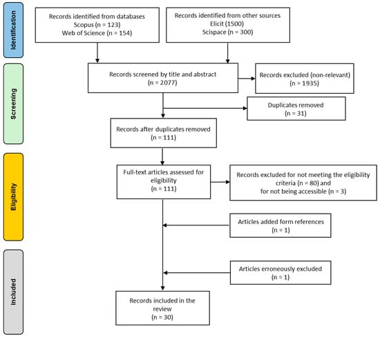 The concluding phase in our methodological approach involved a cursory review of the full texts of all 109 articles (from an initial 111, after excluding the three inaccessible studies and adding the one retrieved from reference tracking) that potentially fulfilled the inclusion criteria. This step was undertaken to verify that no qualifying studies had been inadvertently omitted and that no ineligible studies had been mistakenly retained. In the course of the process, we identified one erroneously excluded article. As a result, 30 records were ultimately included in this review (Figure 1).