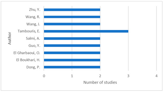 Figure 3 shows the number of studies by authors with more than one publication. The analysis reveals that Tambouris is the most prolific author, with three publications. The papers included in this review feature a total of 91 authors, representing affiliated institutes across 21 countries.