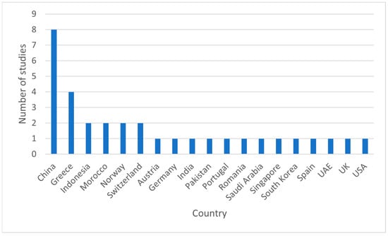 The countries where the studies were conducted (n = 19) are highlighted in Figure 4. In order to present the distribution of papers per country, we set the total number of papers to 33—instead of 30—as one of the studies was cross-national, containing data from four countries (Greece, Singapore, Switzerland, and the USA). China stands out, representing 24% of the total, a position that may be attributed to its top global ranking in both the publication and citation of AI-related research articles [30]. Greece follows at approximately 12%. Indonesia, Morocco, Norway, and Switzerland each represent around 6%. The remaining 39% is distributed equally across 13 other countries.