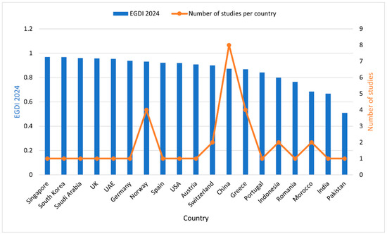 Both countries that rank very high in the EGDI, like Singapore (0.9691) and South Korea (0.9679), and low-ranking ones, like India (0.6678) and Pakistan (0.5096), contributed one publication each. Meanwhile, Greece (0.8674), which ranks close to the average value (0.8594) of the countries in question, produced four. China (0.8718), on the other hand, has the highest number of publications (n = 8), despite its score being relatively close to the average. Norway stands out as the only exception, with a significantly high score (0.9315) and two publications. The absence of a clear positive association may stem from the small number of publications per country, which does not allow for generalizability of the findings. These data are presented for descriptive purposes only and are not intended for statistical inference. It is worth noting that these studies examine not just e-government, but its integration with AI technology. Consequently, the dimension of AI justifies the volume of research papers yielded by China, Norway, and Switzerland, as technologically advanced countries where AI is extensively applied. Although this is not the case for Indonesia and Morocco.