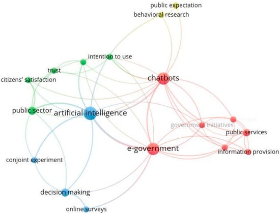 The analysis showed that AI (n = 15), e-government and chatbots (each with n = 11) are the most frequently occurring keywords, grouped into four clusters: red reflects technology and government (e.g., chatbots, e-government), blue includes AI and research methods (conjoint experiment and online surveys), green relates to citizens’ views (e.g., intention to use, satisfaction), and light green covers behavioral research and public expectation.